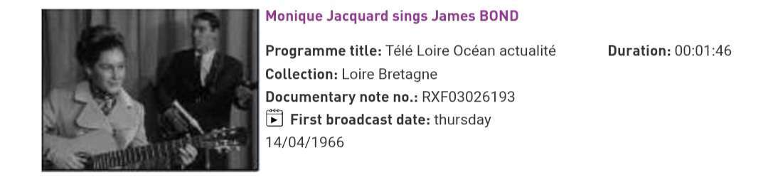 C'est Monique Jacquard - James Bond de 1966, je l'ai trouvé sur le site de l'INA Médiapro, j'était déjà sur la piste de cette chanteuse car un ami avait contacté le réalisateur du documentaire et qui ne savait pas vraiment mais il avait dit que ça pouvait être Monique Jacquard du fait qu'il existe un clip sur Youtube d'une chanson nommé "J'ai tant de peine" et que la chanteuse est similaire à celle de "James Bond"